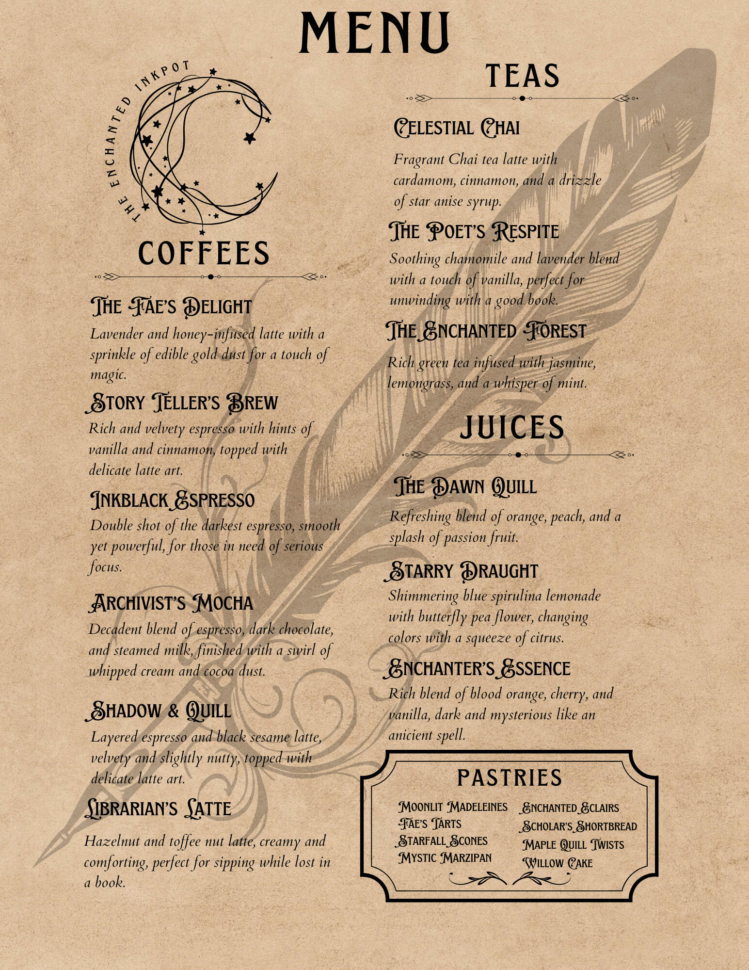 At the heart of the shop, a long, beautifully carved counter serves as the cafe's focal point, where skilled barista O'tali crafts drinks with a touch of artistry. From shimmering elixirs that change color to lattes infused with the essence of wildflowers, each beverage is a small piece of magic in a cup. A glass display case showcases a selection of pastries and sweets. Whether one visits to sip a honeyed lavender tea while penning their own stories or to savor a spiced autumn latte while browsing rare manuscripts, The Enchanted Inkpot promises a moment of serenity, a spark of inspiration, and a gentle reminder that magic can be found in the quietest of places— between the pages of a book, within the swirl of a well-brewed beverage, and in the company of those who believe in the power of stories.