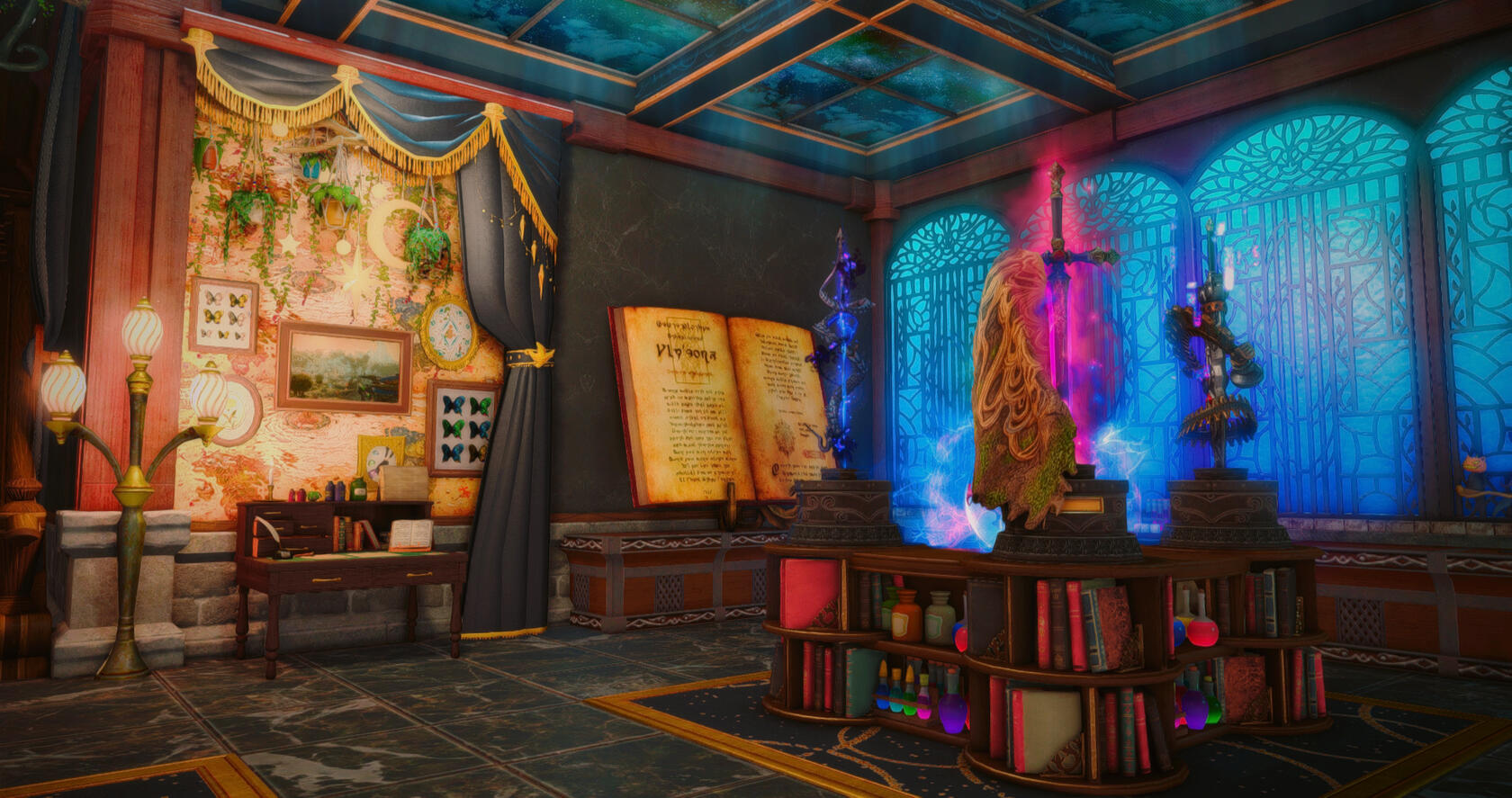 Down in the cozy basement lies Gazardiel's shop of wizard's whimsy— a hidden trove of magical delights tucked beneath the Enchanted Inkpot. Shelves are packed with glittering potions, mysterious vials, and curious enchanted books that whisper secrets when no one’s looking. Strange artifacts rest on a book-lined table, each humming with quiet power or curious charm. Jars of potion-making ingredients, rare crystals, and magical relics line the walls, waiting to be made into something extraordinary. It’s a place of quiet enchantment and discovery, where every item holds a story and every corner begs to be explored.