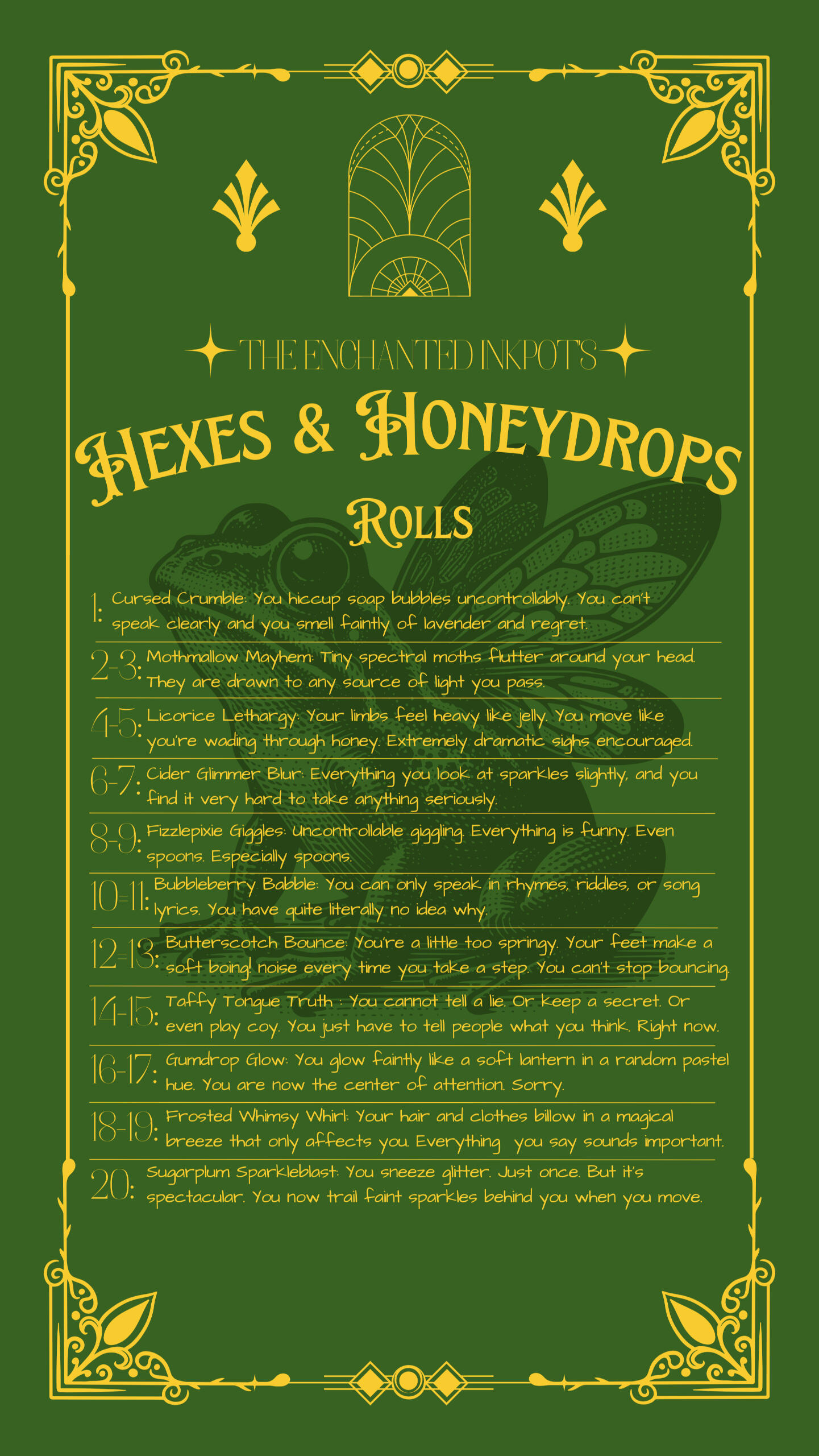 Hexes & Honeydrops is a fun and whimsical game found in the basement of the Enchanted Inkpot. Players simply approach the treat dispenser and receive a random sweet treat, each one tied to a playful effect. In-game, it’s just a harmless treat, but out-of-character, players roll a '/random 20' in chat to determine the outcome. A roll of the dice could result in a temporary magical "hex" or "blessing," with effects lasting for ten minutes— whether it's speaking in rhyme, hiccuping uncontrollably, or not being able to lie. It’s a sweet surprise every time, with a little extra magic on the side.
