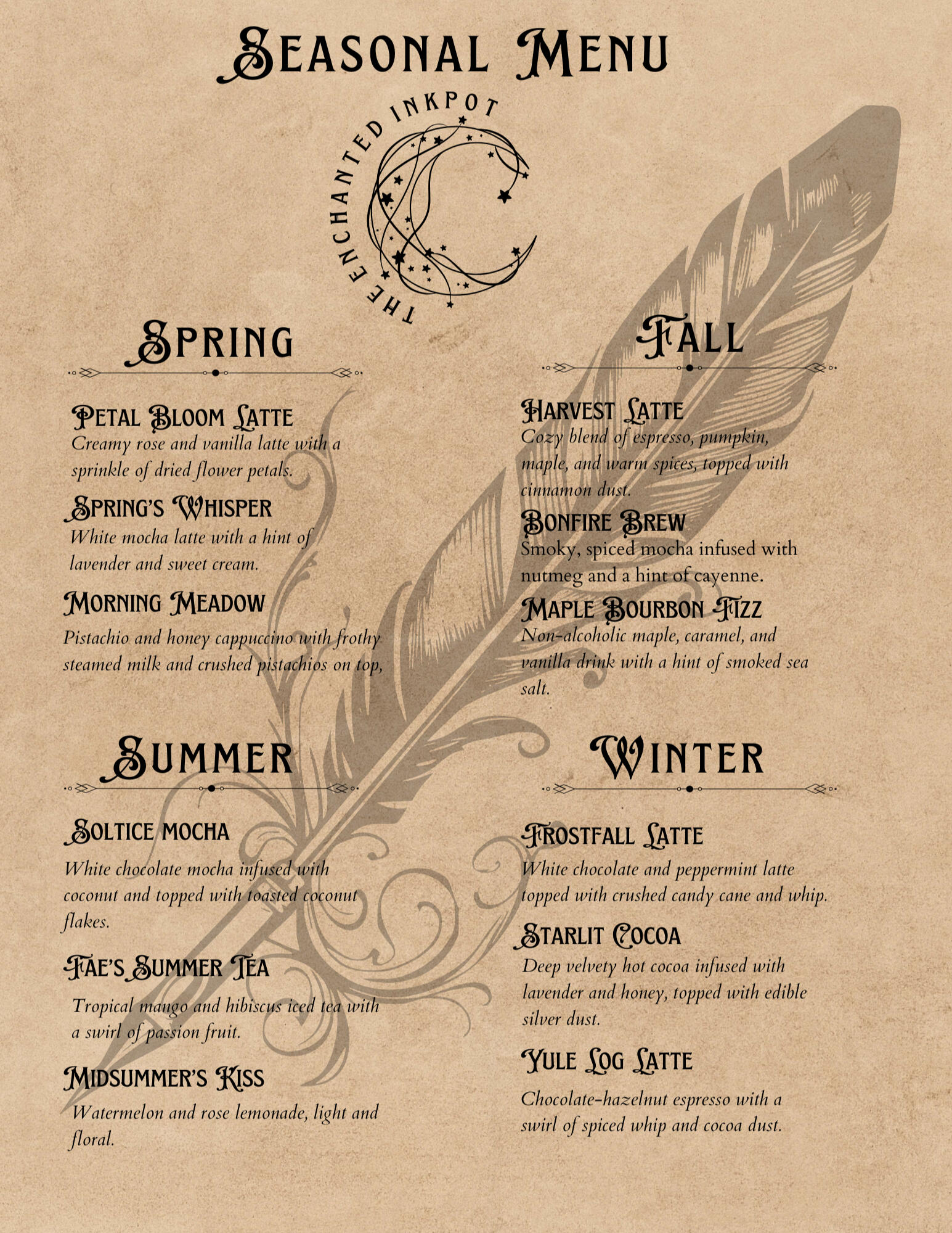 At the heart of the shop, a long, beautifully carved counter serves as the cafe's focal point, where skilled barista O'tali crafts drinks with a touch of artistry. From shimmering elixirs that change color to lattes infused with the essence of wildflowers, each beverage is a small piece of magic in a cup. A glass display case showcases a selection of pastries and sweets. Whether one visits to sip a honeyed lavender tea while penning their own stories or to savor a spiced autumn latte while browsing rare manuscripts, The Enchanted Inkpot promises a moment of serenity, a spark of inspiration, and a gentle reminder that magic can be found in the quietest of places— between the pages of a book, within the swirl of a well-brewed beverage, and in the company of those who believe in the power of stories.